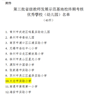 12月26日,江苏省教师培训中心、江苏教育行政干部培训中心公布了第三批省级教师发展示范基地校终期考核结果,太仓市实验小学荣获“优秀”等级。